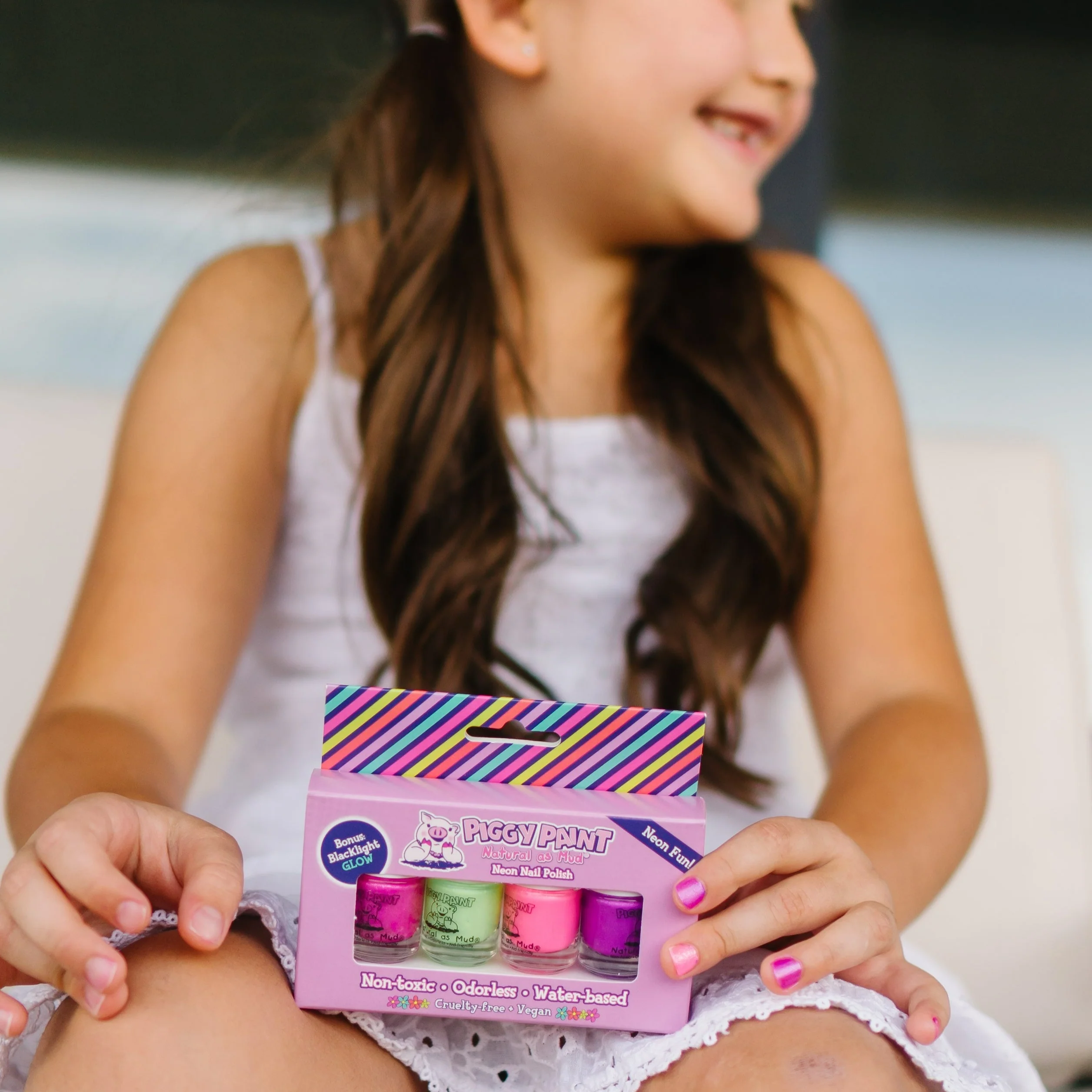 Piggy Paint nail polish is Non-toxic, Virtually Odorless, and Kid-friendly! This Advanced, Water-based formula Dries Hard – and Doesn’t Wash or Peel off. Plus, it’s Safe for Babies, Toddlers, and Kids of all ages! Piggy Paint is a Premium brand that is trusted by parents (& created by a Mom!). ALL the Fun, with NO parabens, phthalates, or harsh chemicals!
